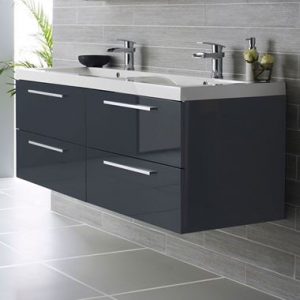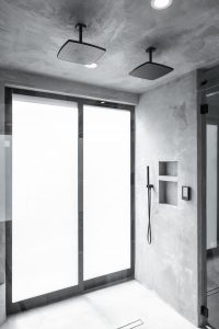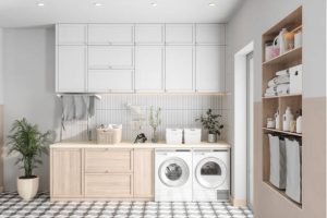 Features These are the features of the Apartment Petrini - Kallista Foundations - Matte Black Modern Laundry Room With Washing Machine, Dryer And Cabinets