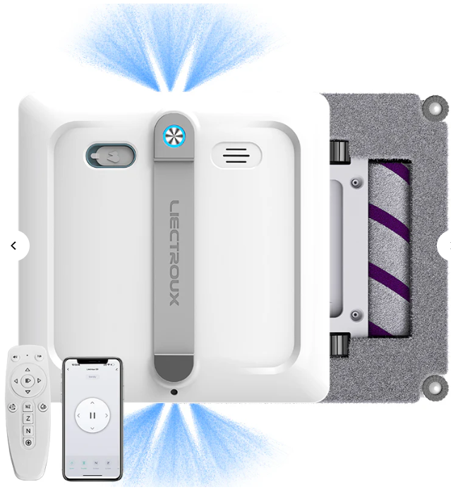 Window cleaning robot Liectroux S9,with 2 roller brushes, 6-way water pump spray, brush-less motor, 9 KPa suction, frameless works, 8 micro-switches, safety rope & power cord 2 in 1, app & remote control with voice prompts.
