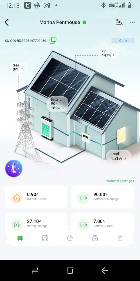 The Hybrid System installed in this Property can maintain daily use including the Air Conditioners. With nominal use, night-time use is supported by the back-up batteries and the house can be autonomous.